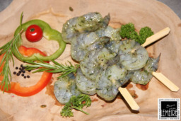 Verse stukjes varkensvlees in een marinade op basis van knoflook, ui, bieslook, dille, peterselie, dragon, rozemarijn,...