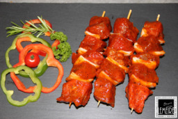 Eerste keus varkensvlees, gemarineerd, gekruid en vermengd met verse groenten (rode paprika, groene paprika en ui).
